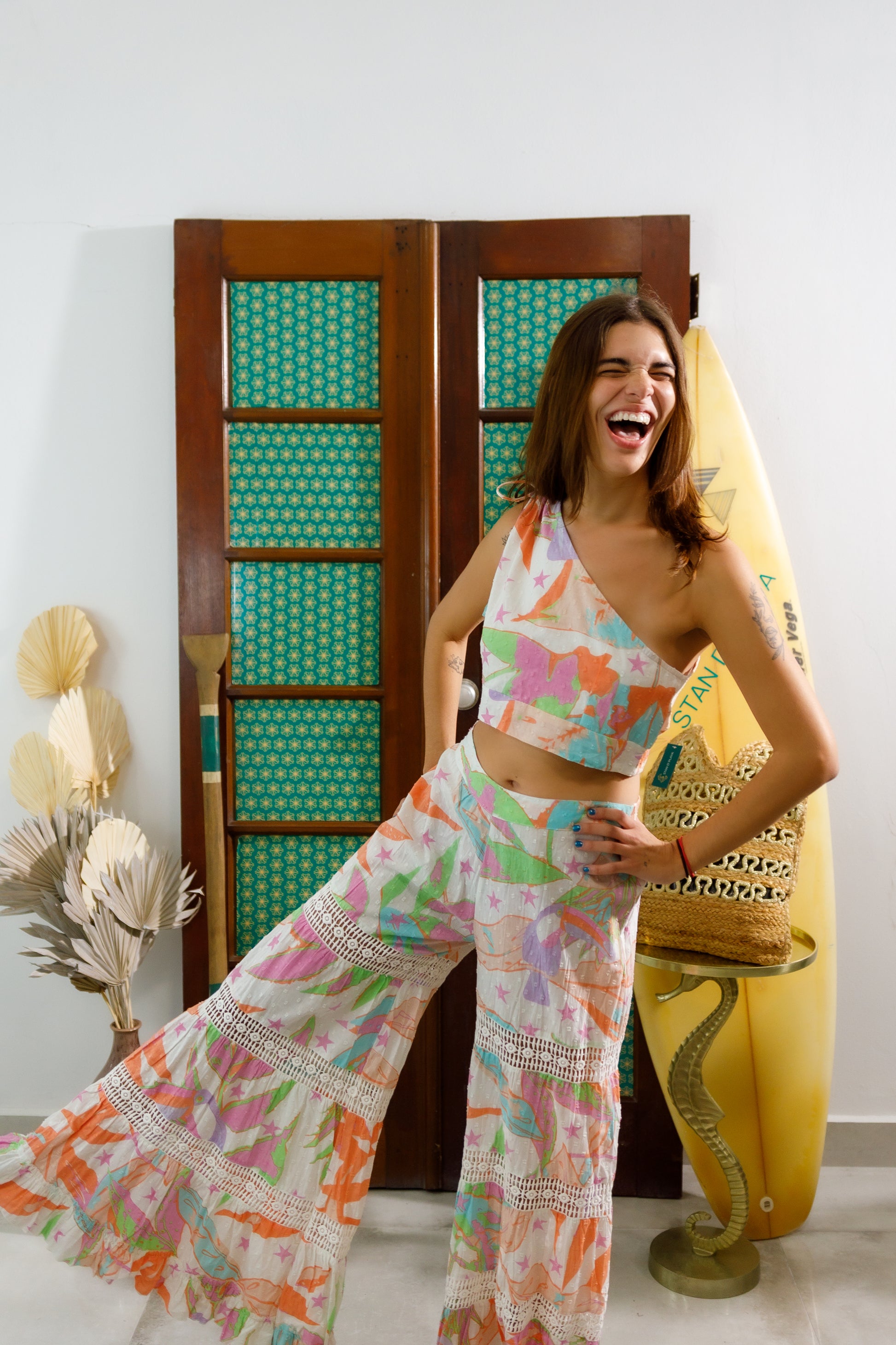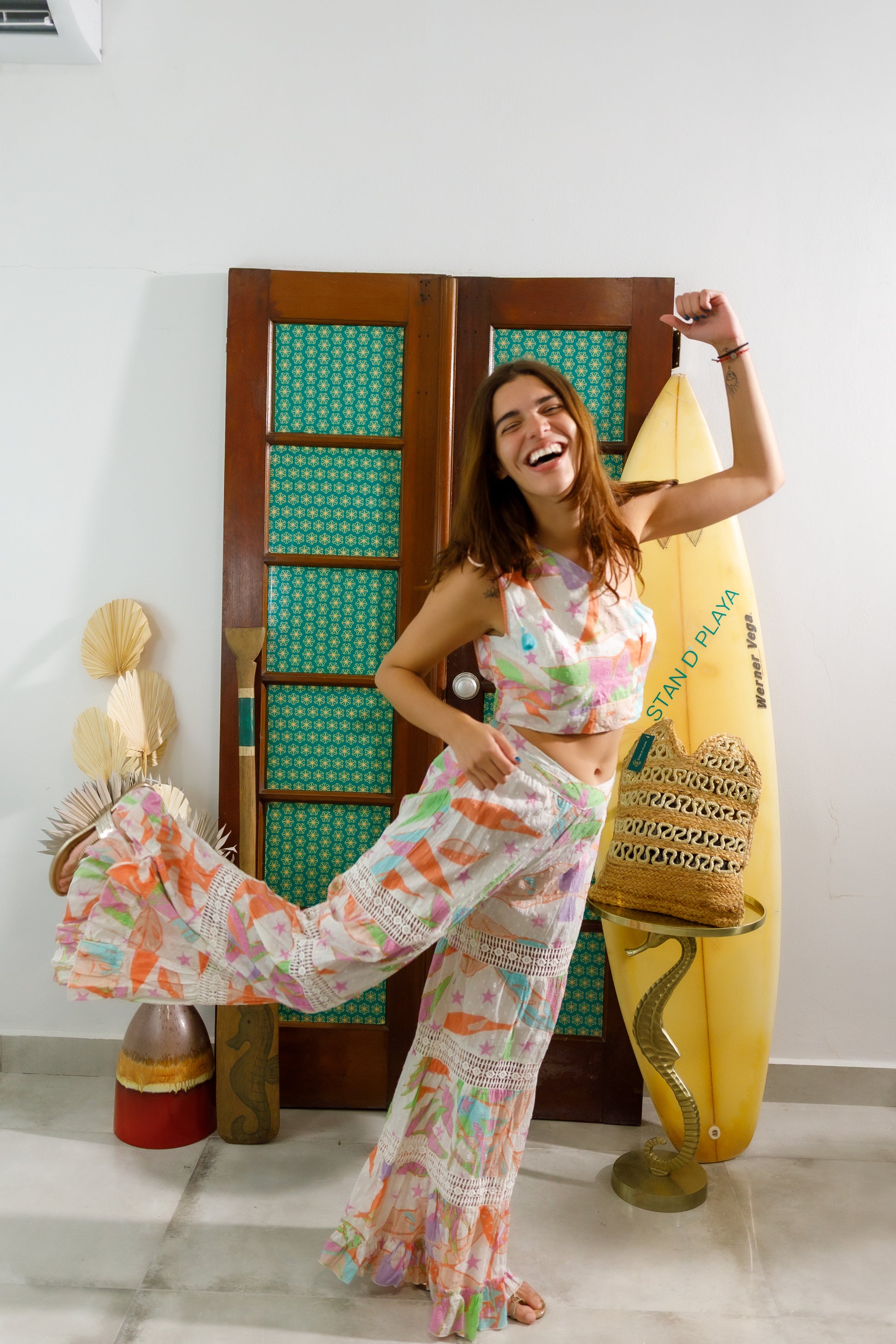 Aisha's set features a vibrant ensemble with a multicolored star pattern that brings playful energy to your wardrobe. The sleeveless cropped top offers a modern silhouette ideal for warm weather or layering, while the accompanying long pants provide comfortable coverage with a stylish edge. This coordinated set balances bold design and wearability, perfect for those seeking a standout yet versatile outfit.