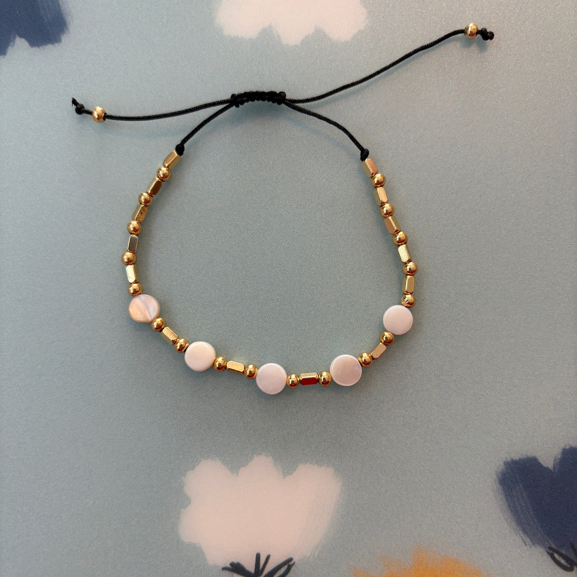 The Armonía Dorada Bracelet features a refined combination of gold and white beads, offering a sophisticated contrast that complements any outfit. Its adjustable strap ensures a comfortable, tailored fit for all wrist sizes, making it both elegant and versatile. Crafted with attention to detail, this bracelet adds a subtle yet distinctive touch of style to your jewelry collection.