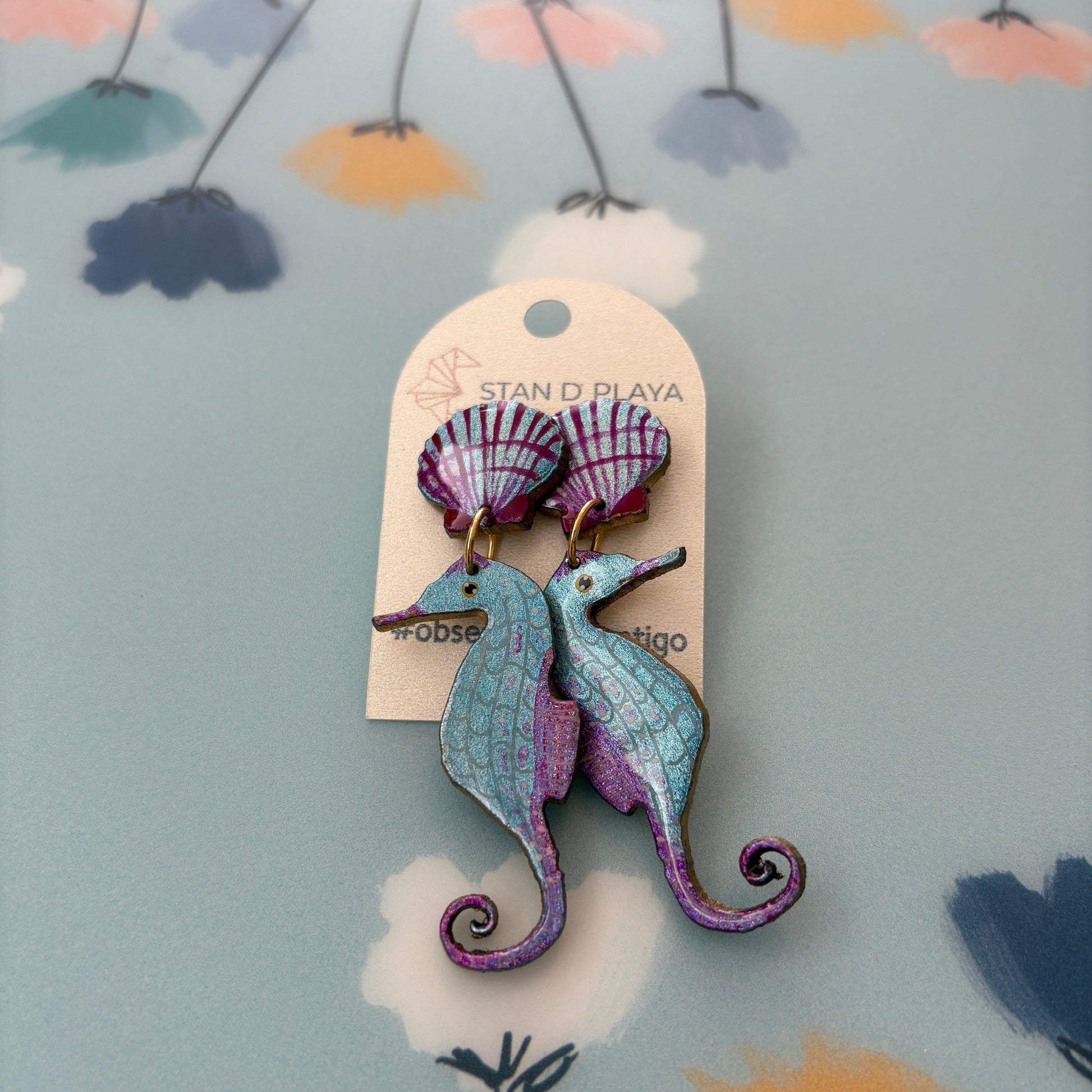 These Cavamar artisanal earrings showcase a beautiful blend of purple and blue seashells adorned with dangling seahorses. Their ocean-inspired design captures the essence of coastal elegance and handmade artistry. Perfect for beach lovers and anyone drawn to unique, statement accessories with a touch of seaside magic.