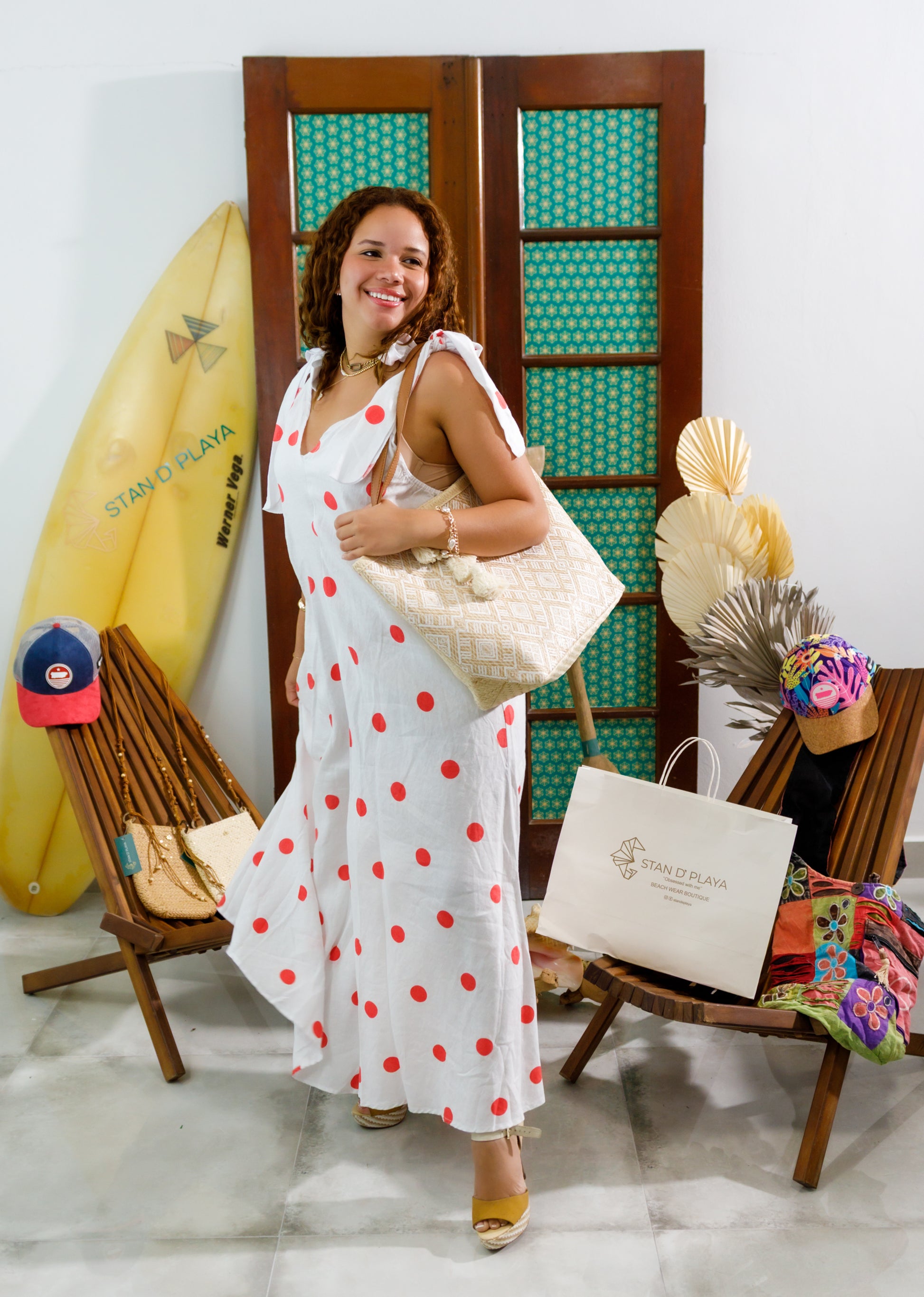 This white jumper features a playful pattern of red dots and includes adjustable straps for a customized fit. Crafted for both style and comfort, it offers versatility for layering or wearing alone, making it a practical addition to any wardrobe.
