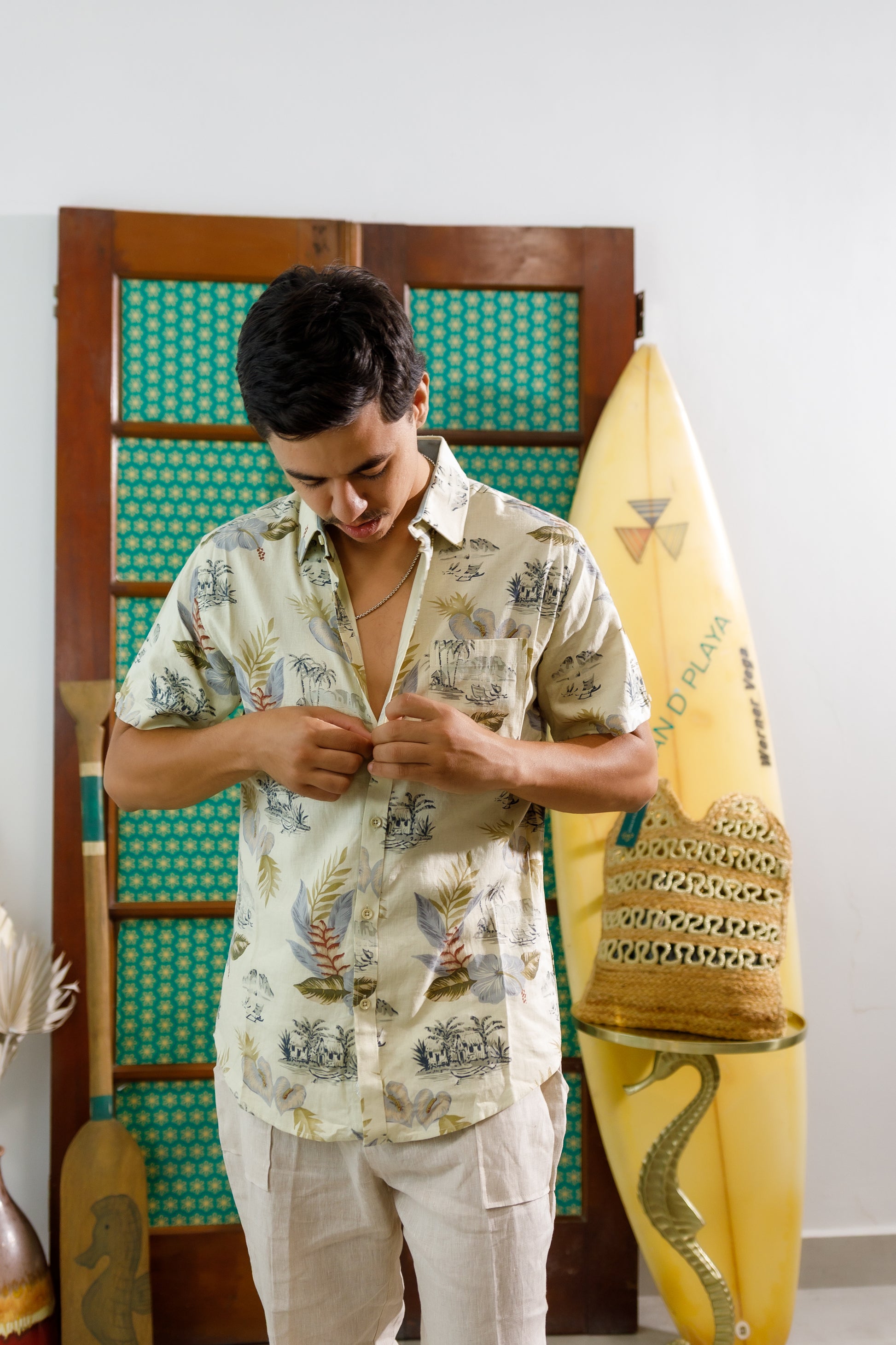 The Coastal Essence Shirt combines understated beige tones with a subtle botanical print, offering a refined yet relaxed look for men. Crafted to balance style and comfort, this shirt is ideal for casual outings or beachside gatherings. Its natural color palette and plant-inspired design evoke a sense of calm, making it a versatile addition to any wardrobe aiming for effortless sophistication.