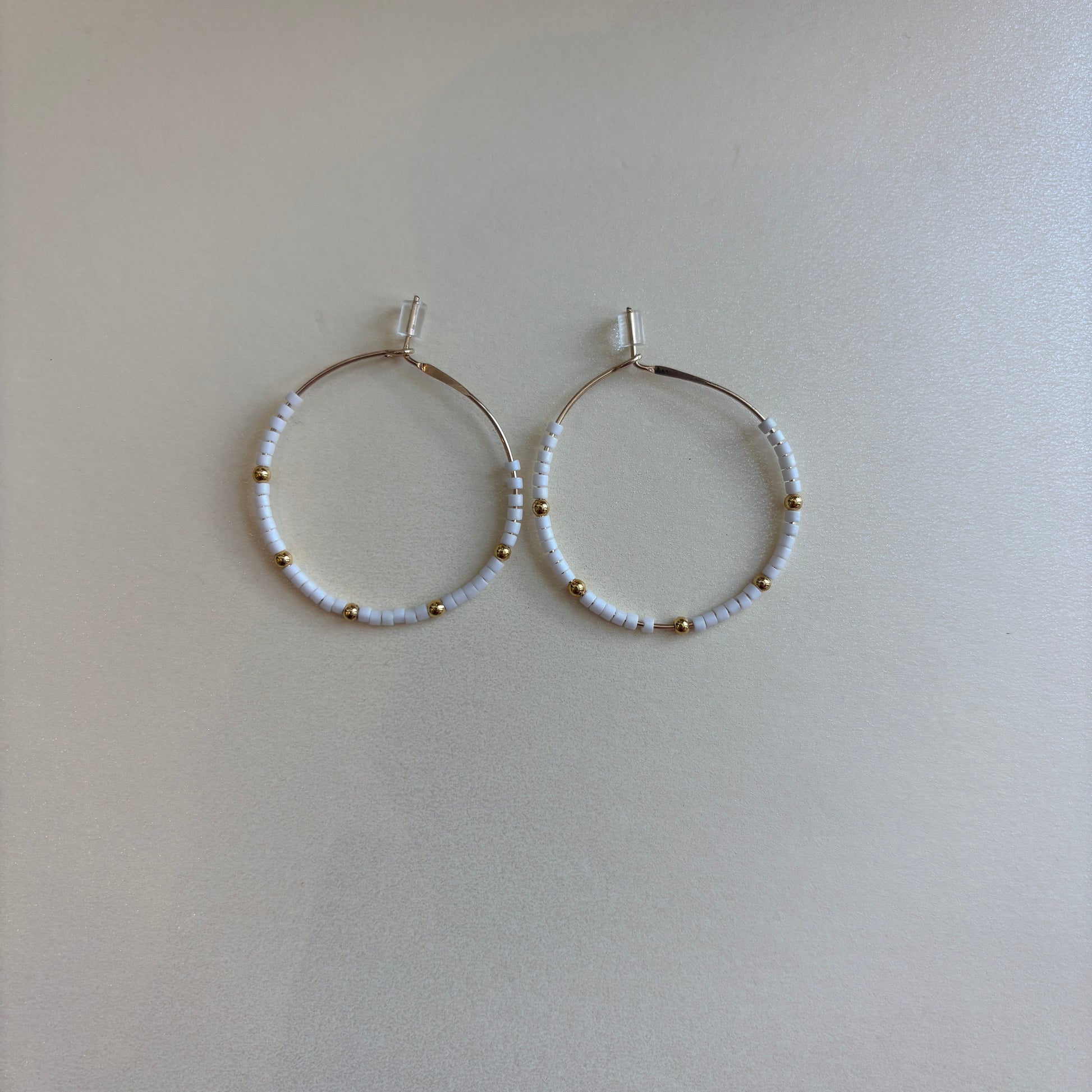 Colores de Sol Earrings bring vibrant elegance to your everyday look. These refined gold hoops feature meticulously arranged colorful beads in a curated palette—turquoise, red, yellow, white, and pink—creating a sophisticated yet playful aesthetic. Available in complementary color-ways including baby pink and baby blue, white and gold, each pair offers versatile styling for both casual and polished occasions. A timeless accessory that celebrates color with understated grace.
