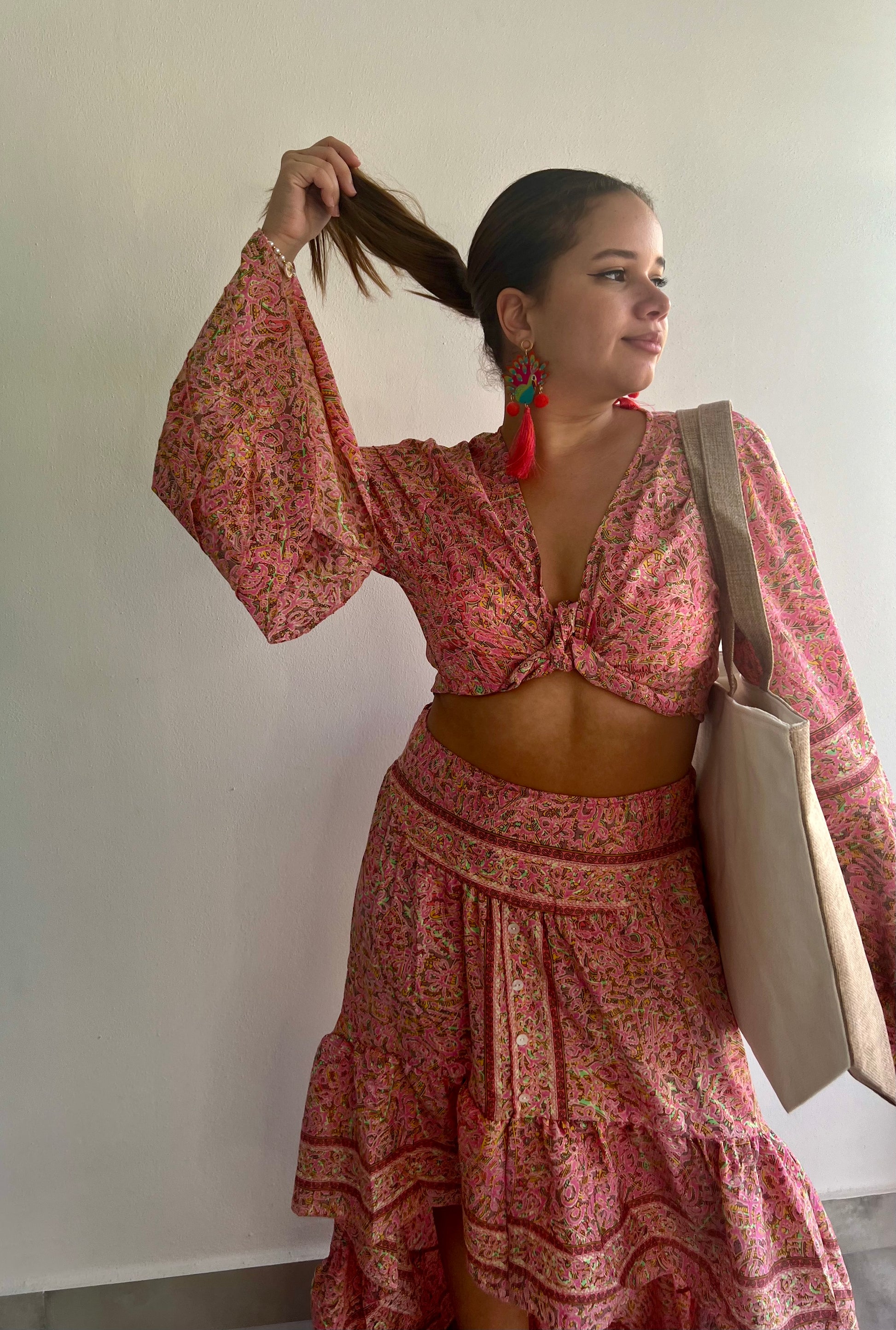 Elevate your wardrobe with Coral's Dream Set, featuring a chic pink long-sleeve cropped top paired seamlessly with a matching skirt. Crafted to offer both style and comfort, this ensemble highlights your silhouette while providing effortless versatility for day or night occasions. The soft coral hue adds a fresh, contemporary touch, making it ideal for those seeking a balanced blend of fashion-forward design and enduring wearability.
