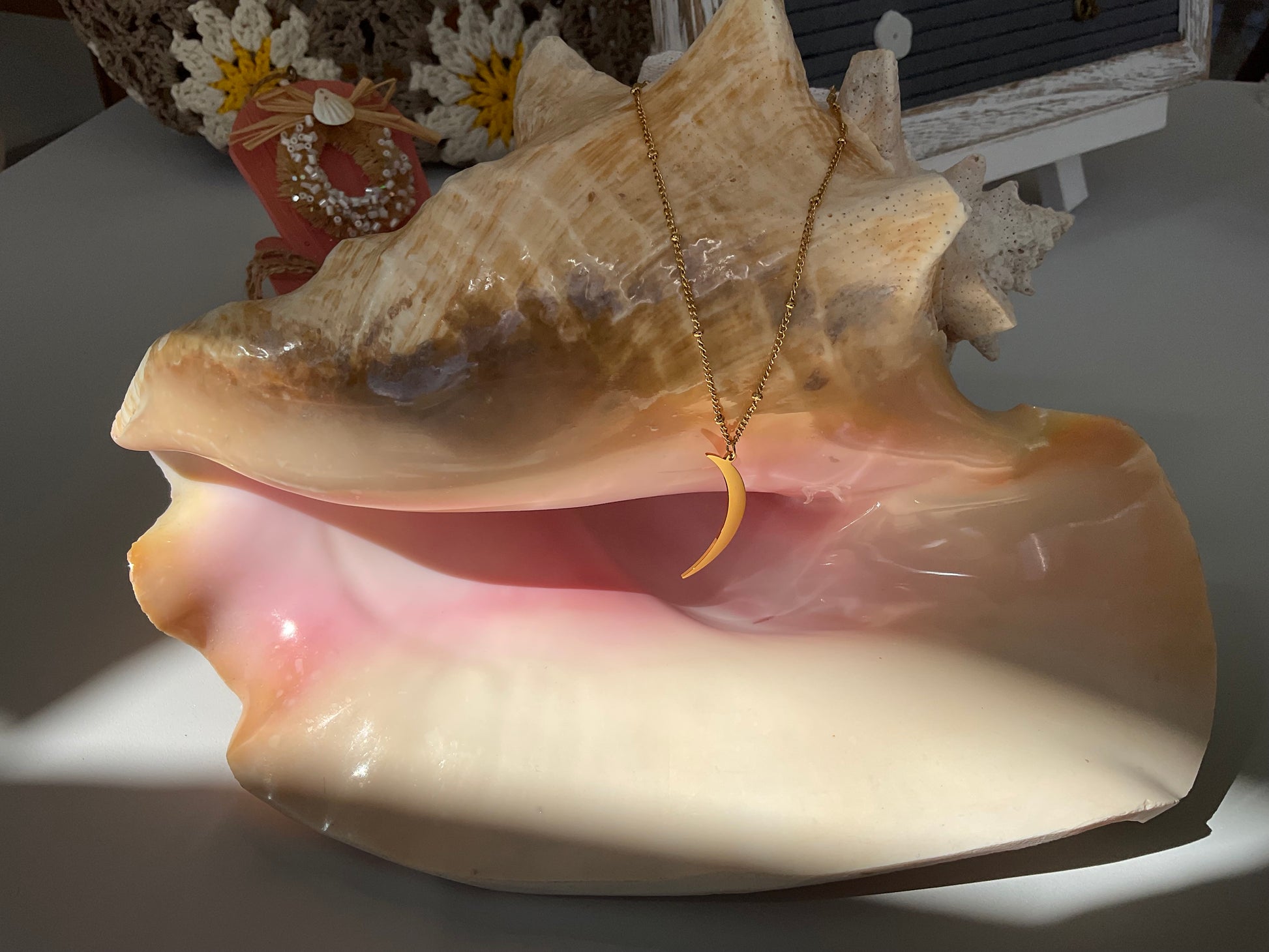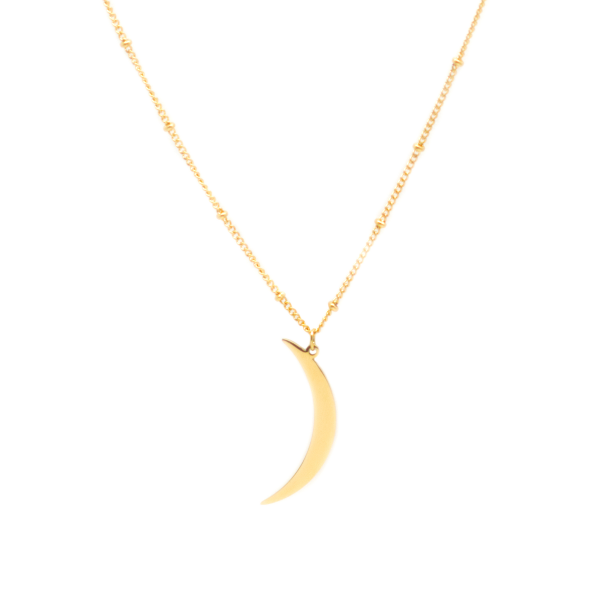 Striking and elegant Crescent Moon Pendant Necklace that goes with anything. Perfect for wearing alone or layering. Product Details Moon charm, 1 1/4" Material: Gold Plated Stainless Steel Size: 16" + 2" extension