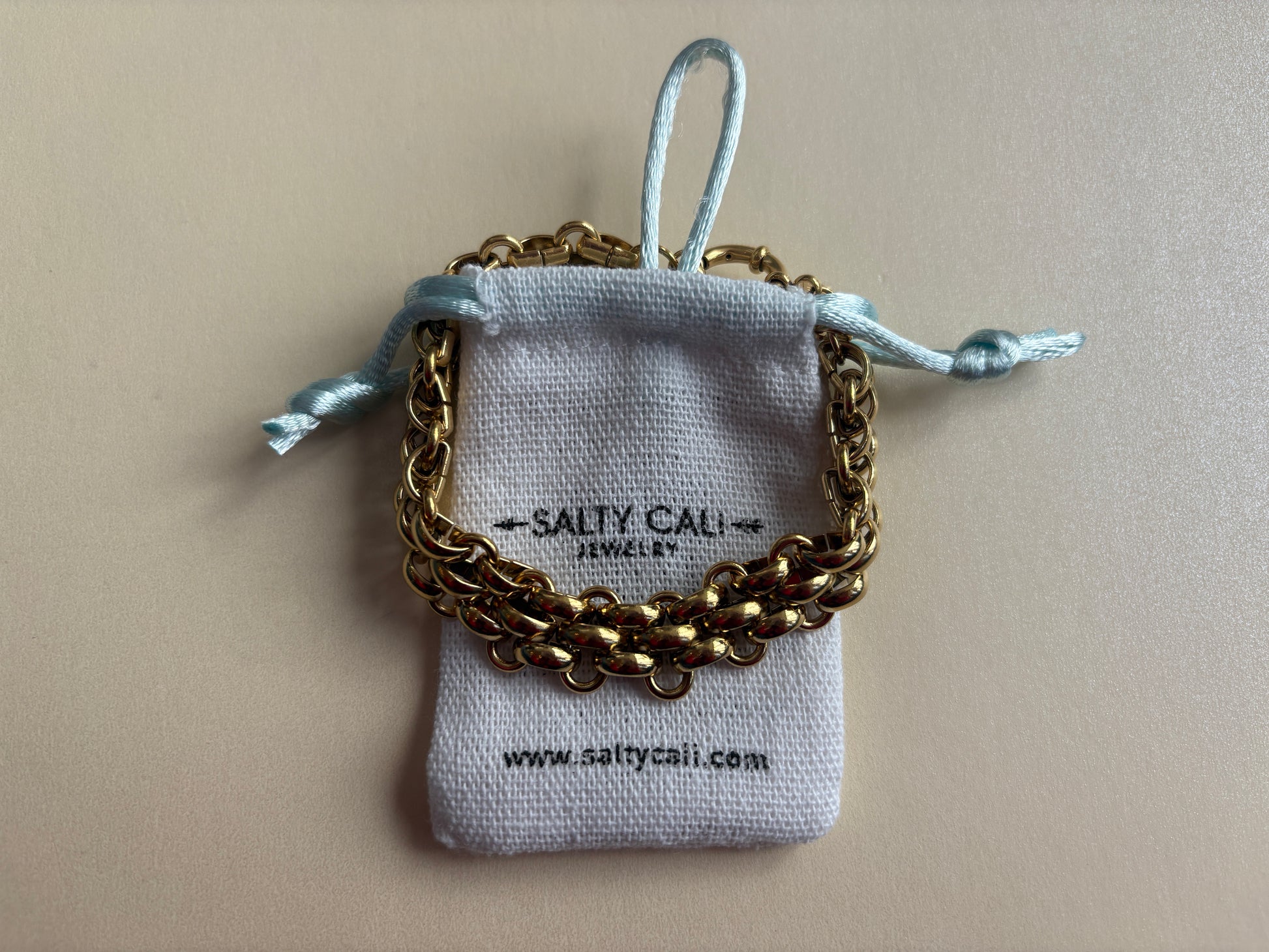 Retro Gold Link Bracelet Channel vintage vibes with this bold, chunky gold bracelet — a timeless piece that adds instant edge to any outfit. The interlocking links chain brings just the right amount of retro flair, while the gold-plated stainless steel keeps it lightweight, durable, and water-friendly. Whether stacked or worn solo, this bracelet brings the perfect touch of statement style. Why You’ll Love It: Retro-inspired interlocking link design Chunky gold look that stands out, but never tries too hard Water and sweat-resistant for everyday wear Made of durable gold-plated stainless steel Stylish sailor clasp Product Details: Stainless steel, Gold plated Size: 7 1/2"