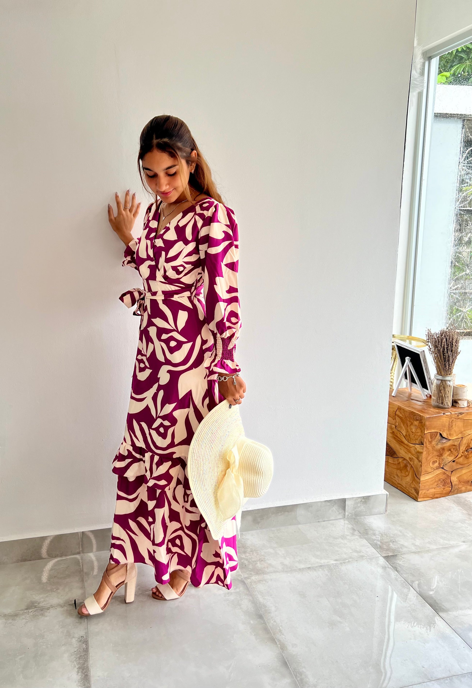 The Luciana maxi dress combines timeless elegance with romantic flair. Crafted in a rich purple hue, this flowing silhouette features long sleeves adorned with delicate floral patterns that add dimension and grace. Perfect for evening occasions, garden parties, or refined casual wear, the Luciana offers a sophisticated look that transitions effortlessly from season to season. The maxi length provides an elongated, flattering profile while the intricate floral detailing ensures you'll stand out with understated luxury.