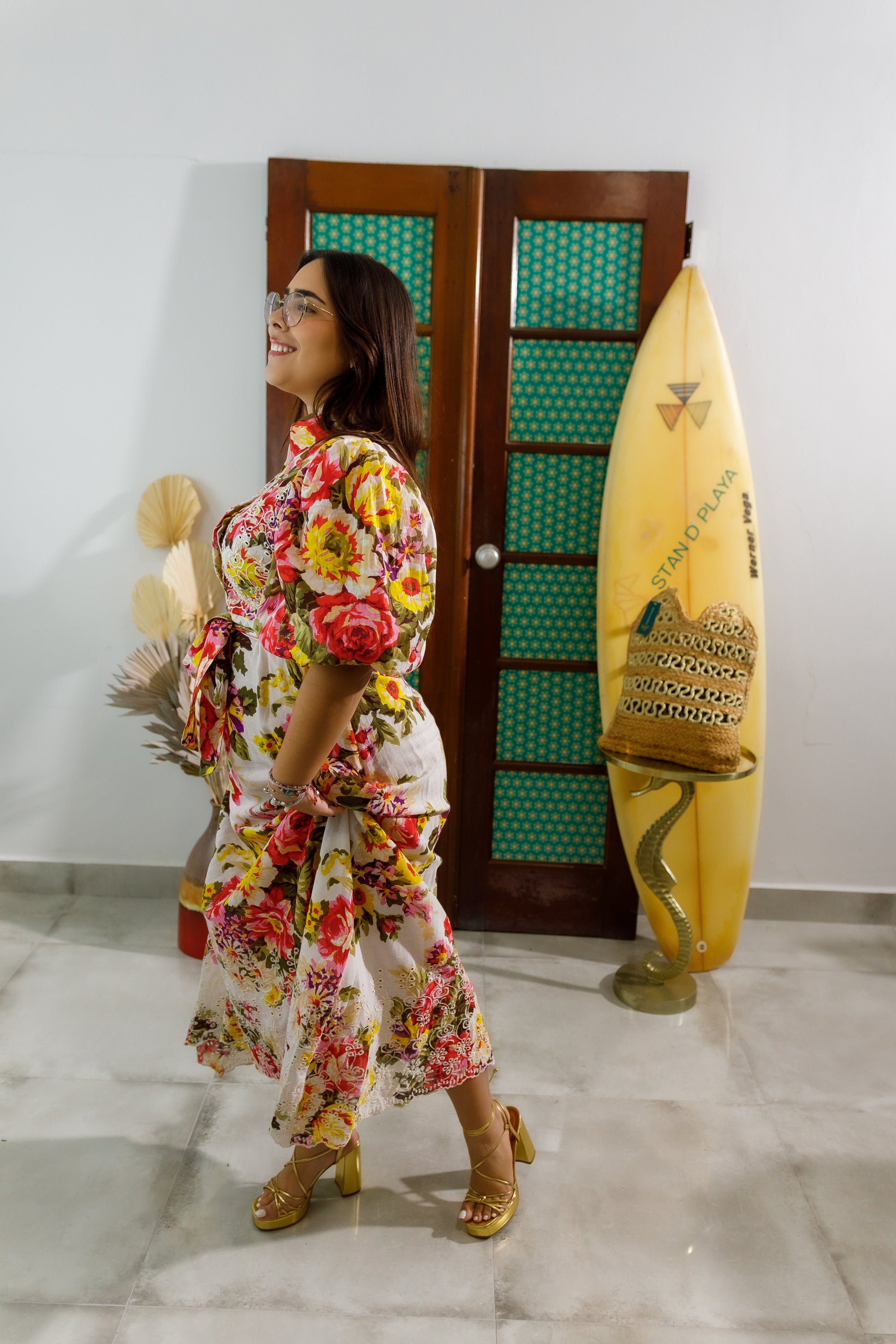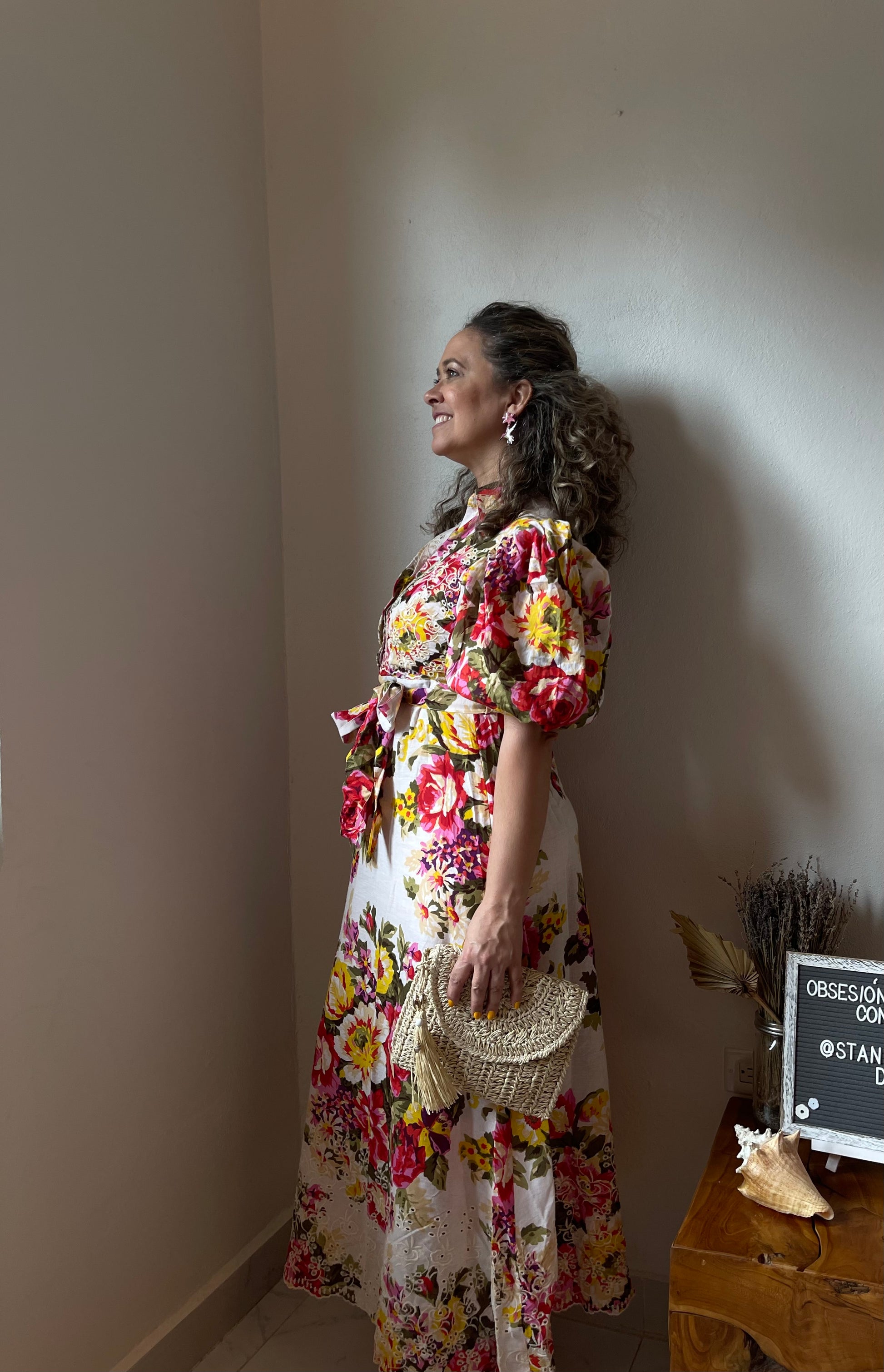 This multicolored long fiesta maxi dress features a vibrant floral pattern designed to capture attention and celebrate every occasion. Crafted for both comfort and elegance, its flowing silhouette ensures ease of movement while enhancing your figure. Ideal for festive events or garden parties, this dress combines bold colors with a flattering cut, making it a standout addition to your wardrobe.